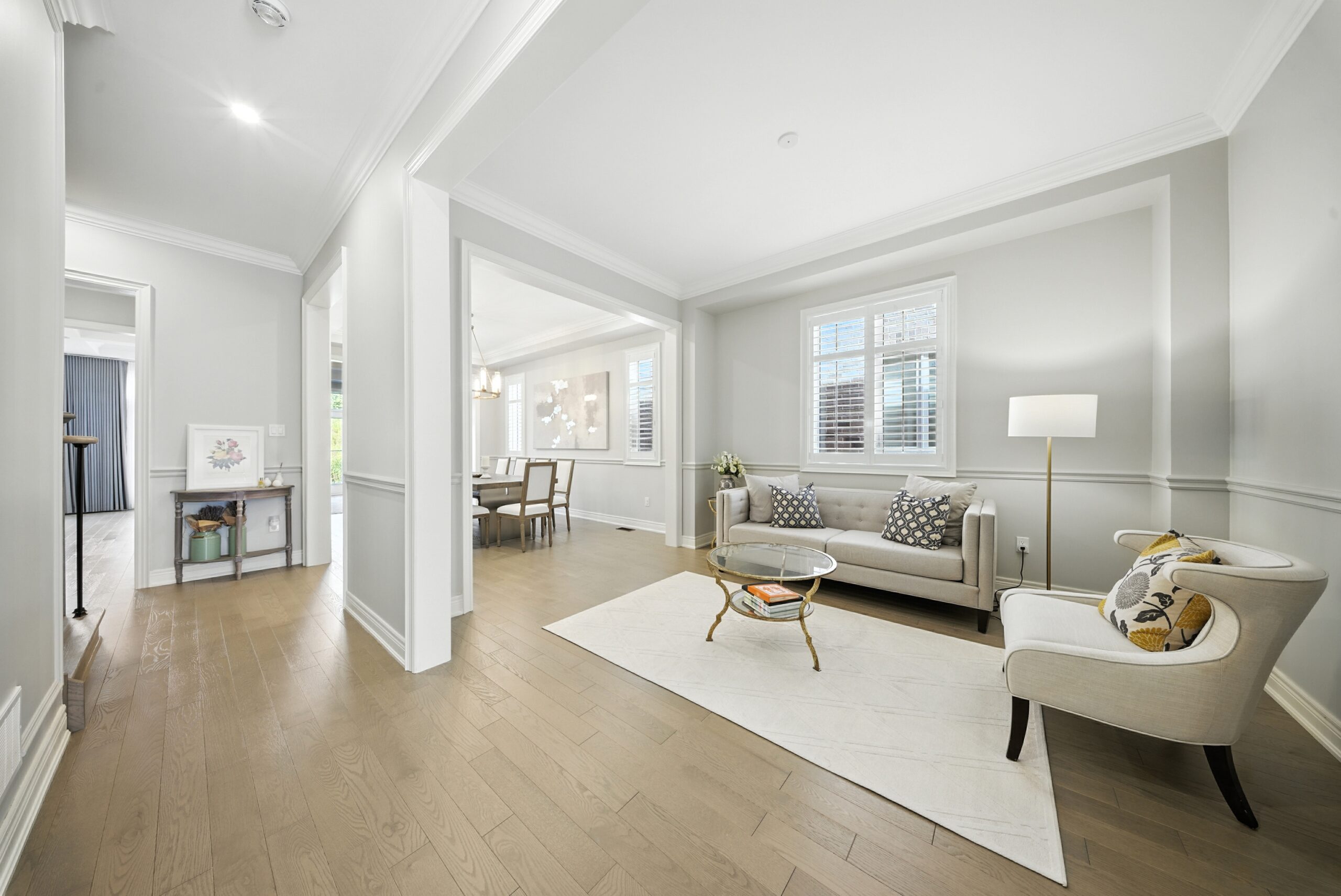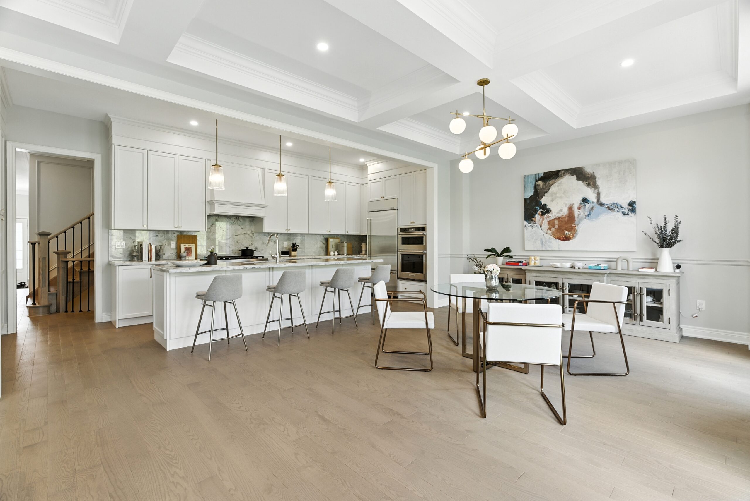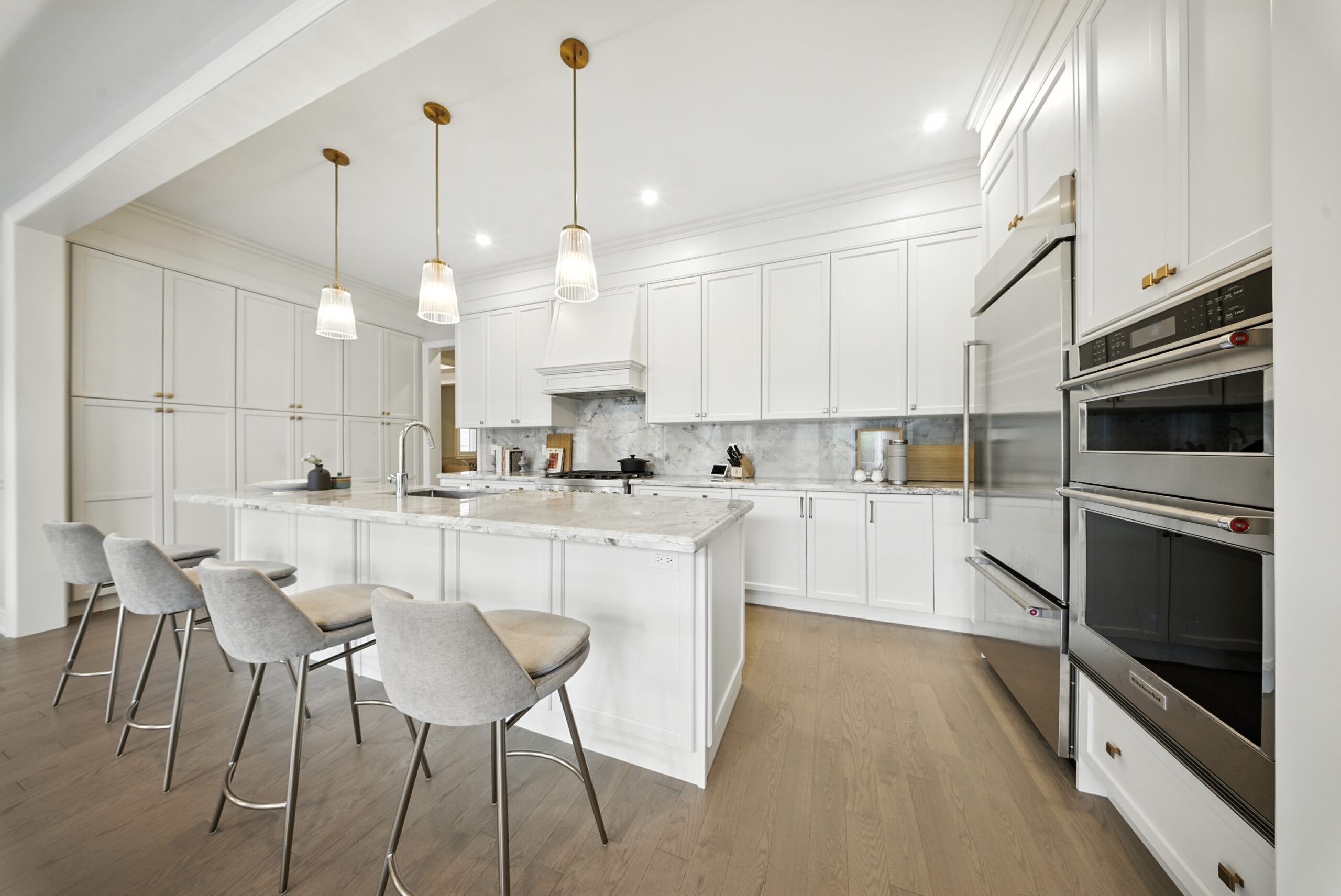 The main floor impresses with 10ft ceilings, upgraded 8ft doors on both main and second floors, wide-plank hardwood flooring, elegant crown mouldings, and pot lights throughout. All bedrooms offer ensuite bathrooms and walk-in closets, with the primary suite featuring two walk-in closets and a spa-like ensuite.