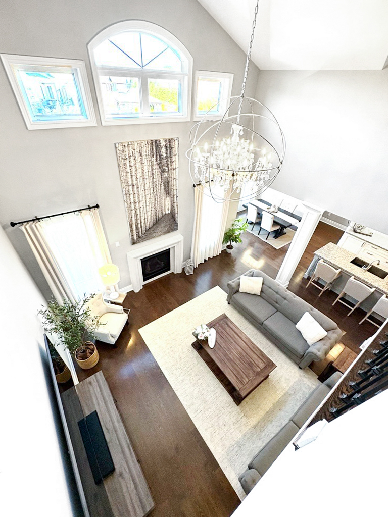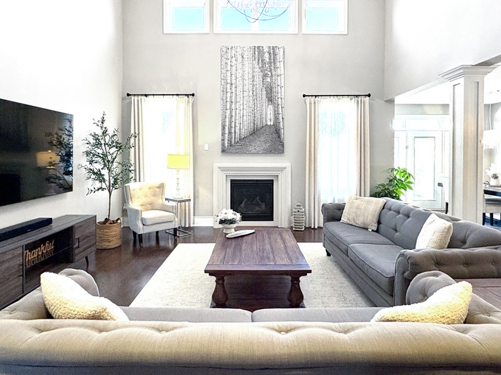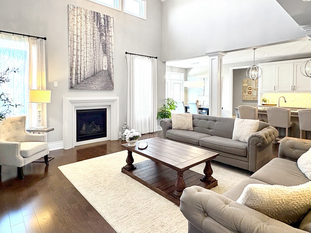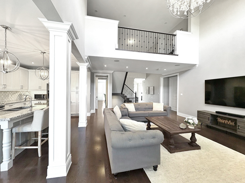 The main floor impresses with soaring ceilings, sun-filled spaces, a formal dining room with a built-in serving station, and a private main-floor library. The eat-in kitchen anchors the home with a generous island, walkout breakfast area, and seamless flow to the cathedral-ceiling great room with gas fireplace.
