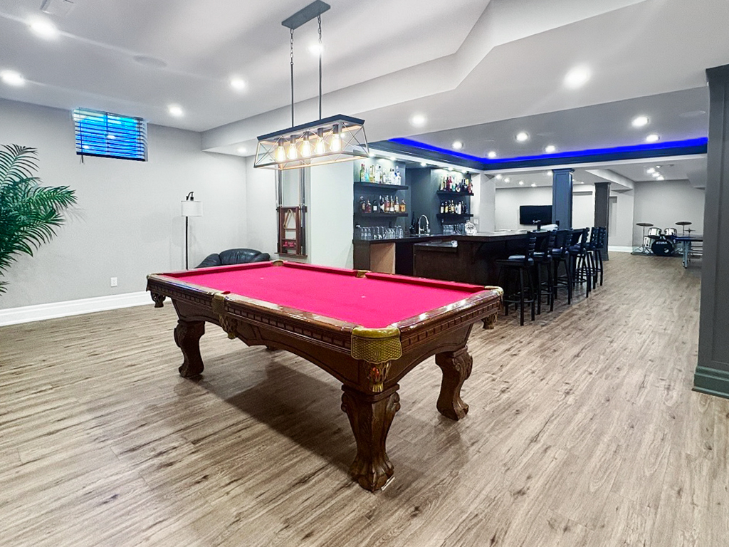 Upstairs, the loft features two more bedrooms, a full bath, and a lounge ideal for guests, play, or media. The massive finished basement features 9-ft ceilings, built-in speakers, a 16-ft custom wet bar with beer tap, a home theatre with 7.2 surround sound, large rec room, a sixth bedroom, and a designer 3-piece bath with glass-enclosed steam shower. Outdoors, enjoy a sun-filled and professionally landscaped, low-maintenance yard with a heated saltwater inground pool, waterfall feature, built-in speakers, gas BBQ line, and a gazebo for outdoor dining.